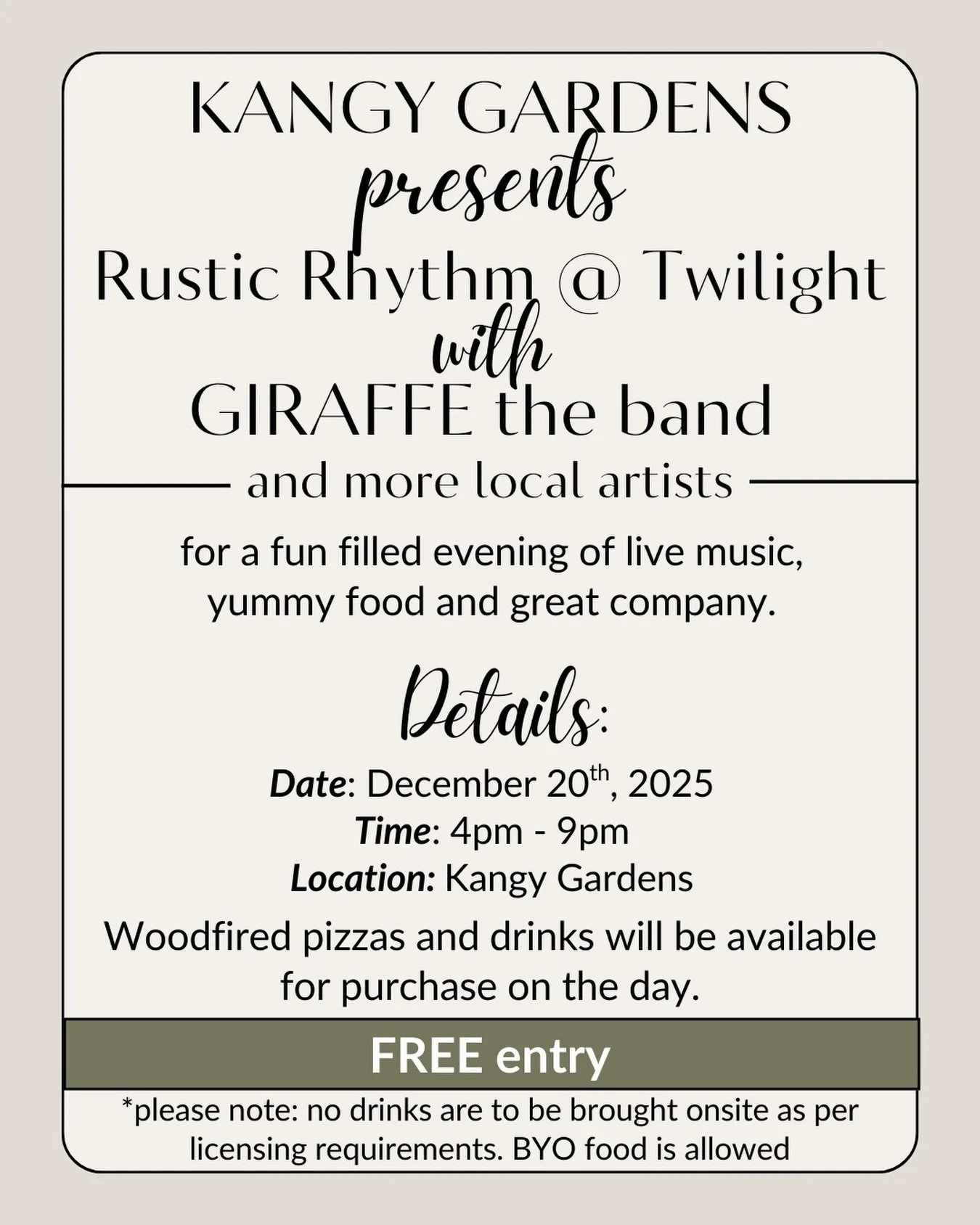 Kangy Gardens presents Rustic Rhythm @ Twilight with local artists including The Giraffe live band. What a year it has been and we canโt way to say goodbye to 2025 with a night filled with fun, live music and great company.